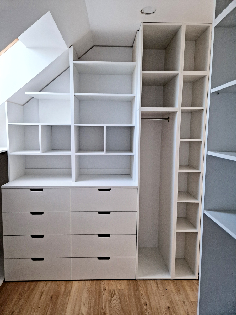 Pracowania stolarska Meble G&B Piwowarczyk jako jedną z głównych usług w ofercie ma wykonanie nowoczesnej szafy na wymiar oraz innej szafy na zamówienie, która będzie stworzona na dowolny kształt wnęki. Taką szafy do zabudowy możemy zaprojektować wspólnie. Razem dobrać kolor frontów, rodzaj uchwytów i kolorystykę całości. Jeżeli szukasz opcji na poddasze, a tam zależy Ci, żeby nie marnować miejsca ze względu na skosy – w ofercie mamy szafy skośne. Nie ma lepszego rozwiązania w przypadku, gdy aranżujemy wnętrze poddasza, lub wnęka jest pod skosem z innego powodu.